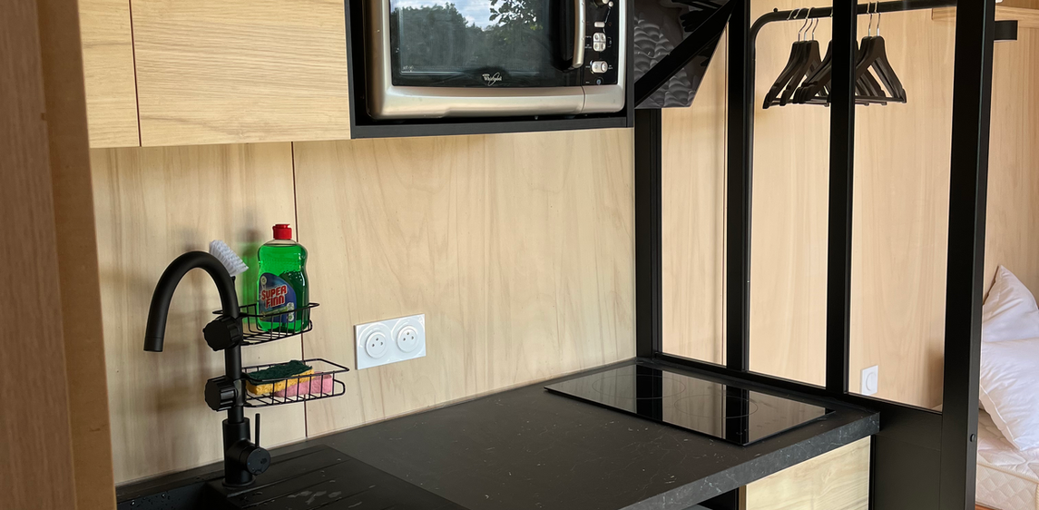 Lodge de 15m2 aménagé pour 2 personnes avec terrasse privée face à une grande prairie et au coucher de soleil